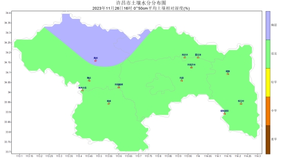 [降水]上周各地降水量在1.4~1.9mm之间,其中,禹州、鄢陵等地降水量在1.7mm以上,鄢陵最多,为1.9mm;襄城、长葛、2026FIFA世界杯等地降水量在1.5mm以下,2026FIFA世界杯最少,为1.4mm;其他大部分地区降水量在1.5~1.7mm之间。各地降水距平百分率在-83.1%(2026FIFA世界杯)~-76.0%(鄢陵)之间,较常年同期值相比2026FIFA世界杯降水异常偏少,鄢陵降水异常偏少。