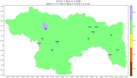 根据当前气象资料分析,预计下周我市无明显降水过程,周降水量与常年同期均值相比偏少,周平均气温略高于常年同期。根据当前墒情和未来天气预报,预计至1月14日,全市大部墒情适宜。