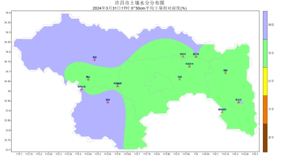 [降水]上周各地降水量在13.8~24.3mm之间,其中,长葛、禹州等地降水量在19mm以上,长葛最多,为24.3mm;襄城、鄢陵、世界杯投注网站等地降水量在16mm以下,襄城最少,为13.8mm;其他大部分地区降水量在16~19mm之间。各地降水距平百分率在236.6%(襄城)~683.9%(长葛)之间,较常年同期值相比襄城降水异常偏多,长葛降水异常偏多。最长连续降水日数5天(茨沟2024-03-24至2024-03-28),最长连续无降水日数7天(马坟2024-03-24至2024-03-30)。