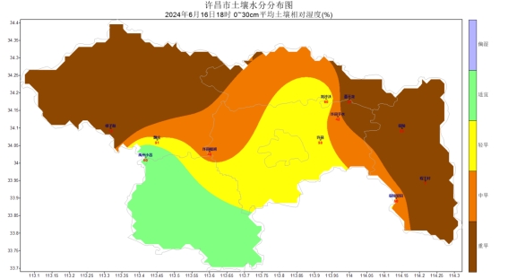 [降水]上周各地降水量在0~25.4mm之间,其中,农场、椹涧、大鸿寨等地降水量在11mm以上,椹涧最多,为25.4mm;神垕、陈化店、顺店等地无有效降水,其他大部分地区降水量在11mm以下。各地降水距平百分率为-100.0%(襄城),较常年同期值相比襄城降水异常偏少。最长连续降水日数2天(大鸿寨2024-06-14至2024-06-15),最长连续无降水日数7天(禹州2024-06-09至2024-06-15)。