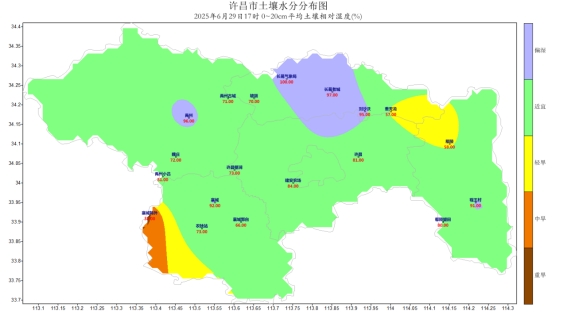 [土壤墒情]根据2025年6月29日17时0-20cm自动土壤水分监测资料显示,全市适宜测站占比53%;偏湿测站占比32%,干旱测站占比15%。