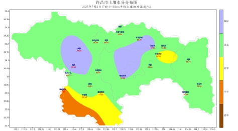 [土壤墒情]根据2025年7月6日17时0-20cm自动土壤水分监测资料显示,全市适宜测站占比60%;偏湿测站占比20%,干旱测站占比20%。
