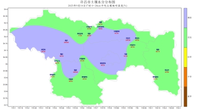 [土壤墒情]9月14日17时自动土壤水分监测资料显示:全市土壤表层(0-20 厘米)墒情适宜测站比例为61%,偏湿测站比例为39%。目前土壤偏湿主要分布在中部和西部地区。