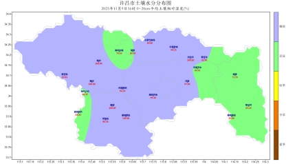 [土壤墒情]11月9日16时自动土壤水分监测资料显示:全市土壤表层(0-20 厘米)墒情适宜测站比例为38%;偏湿测站比例为62%,较上周增加了19个百分点。其中29%的测站土壤水分过饱和。