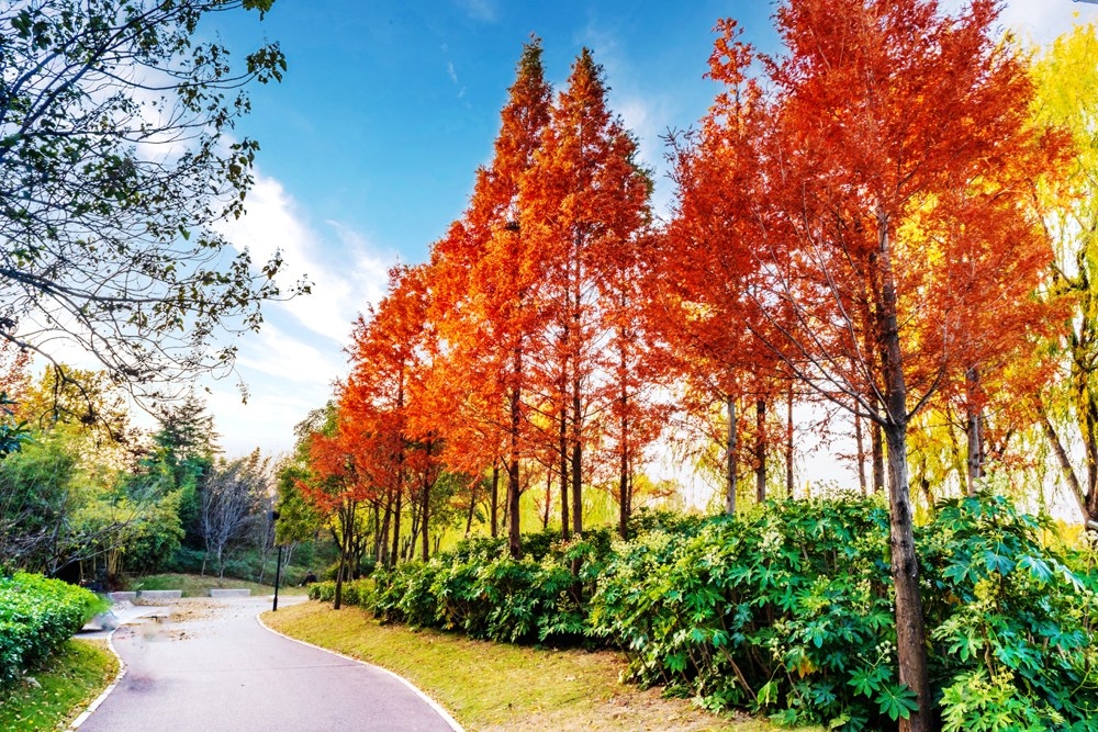 道路两边,银杏树挺拔林立,金黄的叶片布满枝头,仿佛千万只蝴蝶在微风中翩翩起舞。深秋的红叶如火如荼,点缀着城市的各个角落,它们在阳光下熠熠生辉,为这座城市增添了一抹温暖的色彩。